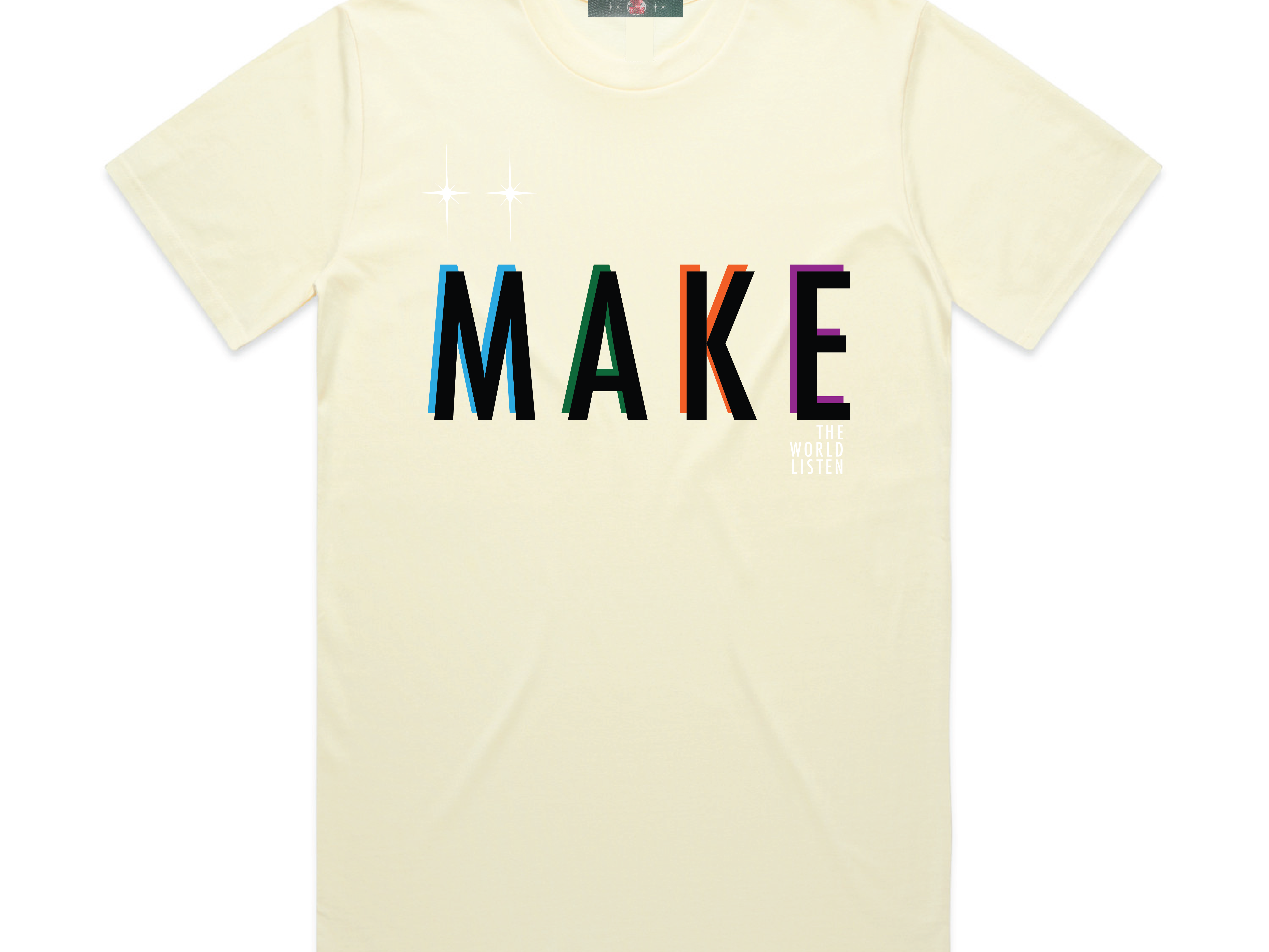 A refined expression of the brand’s ethos, the MAKE signature Tee pairs minimalist elegance with global symbolism. The front features the iconic MAKE logo rendered in crisp white screen print, accented by twin stars as a mark of aspiration. On the reverse, the classic globe emblem emerges in a tonal raised black screen print, offering subtle texture and depth.